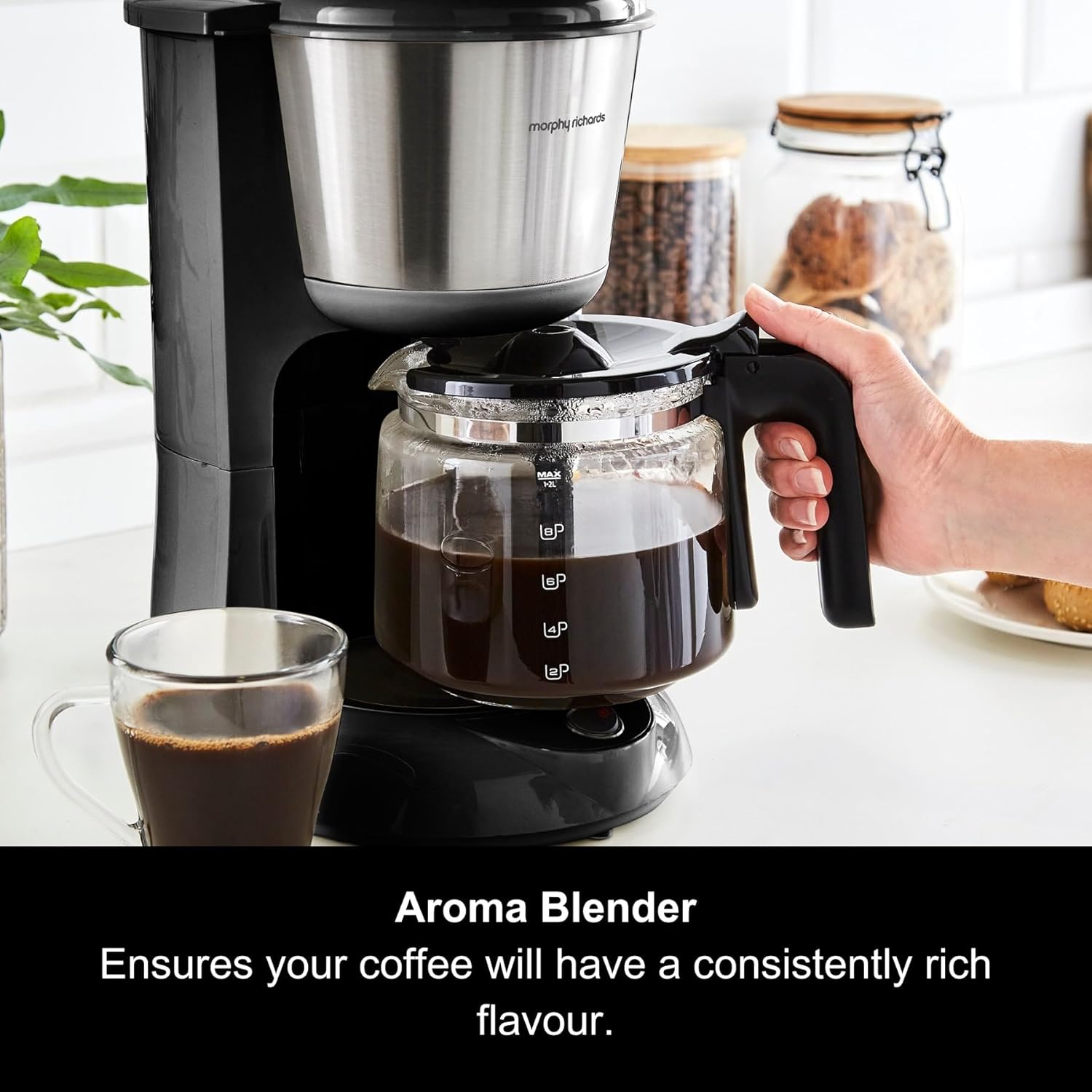 Morphy Richards Equip Filter Coffee Machine, Coffee Maker for Instant Coffee, Pour Over Technology, 10 Cup, Anti Drip, Reusable Filter, Keep Warm, Aroma Blender, Black/Brushed Steel, 162501