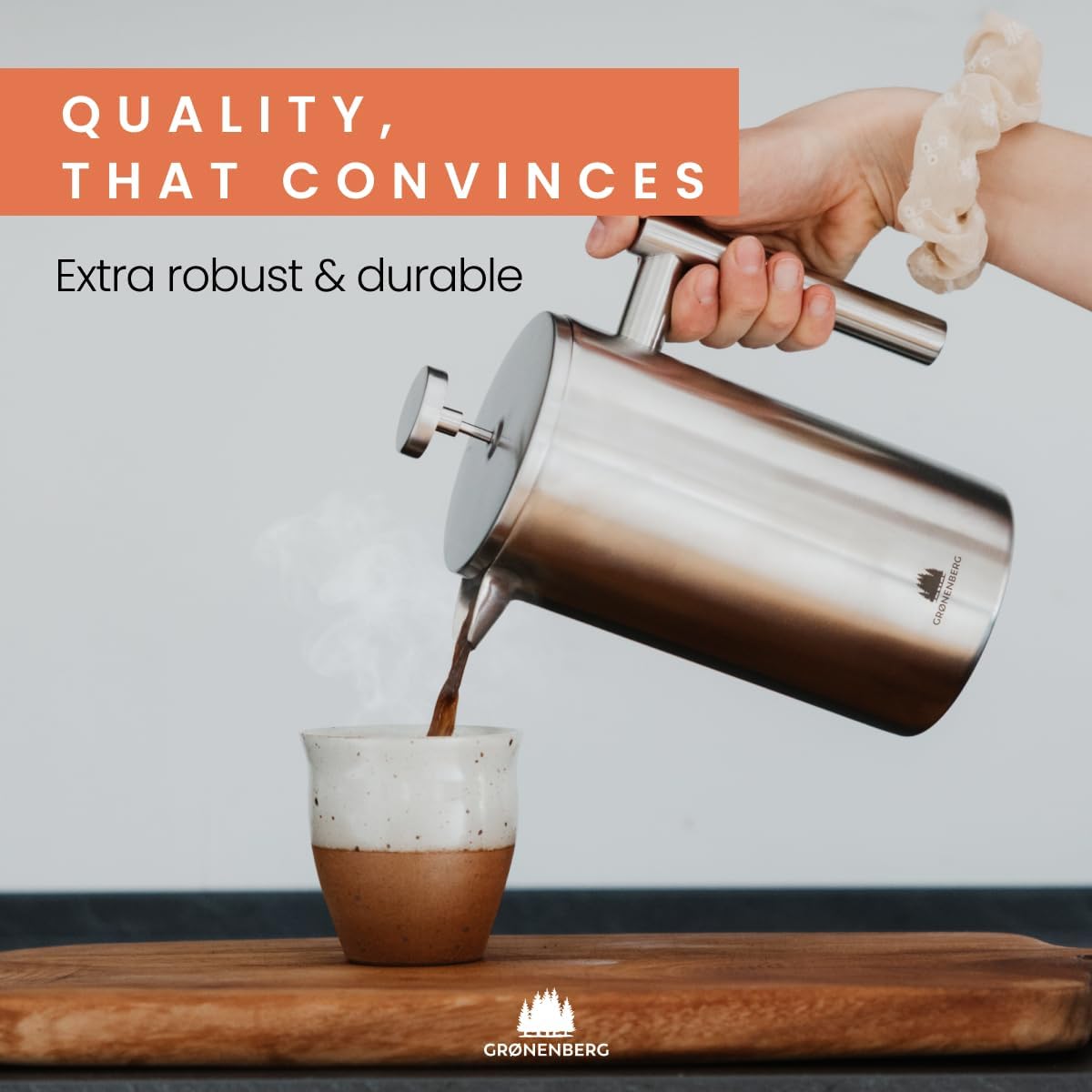 ✔ ELEGANT DESIGN: The stainless steel French press combines timeless design with durability. The coffee press for ground coffee is rust-proof & 100% food-friendly