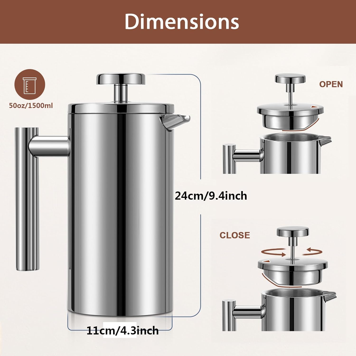 Wrobic Cafetiere French Press Coffee Maker, 1500ml/50oz large insulated cafetiere, Double-Wall Insulated Stainless Steel, 3 Level Filtration System, French Press for Home, Camping and Office, Silver