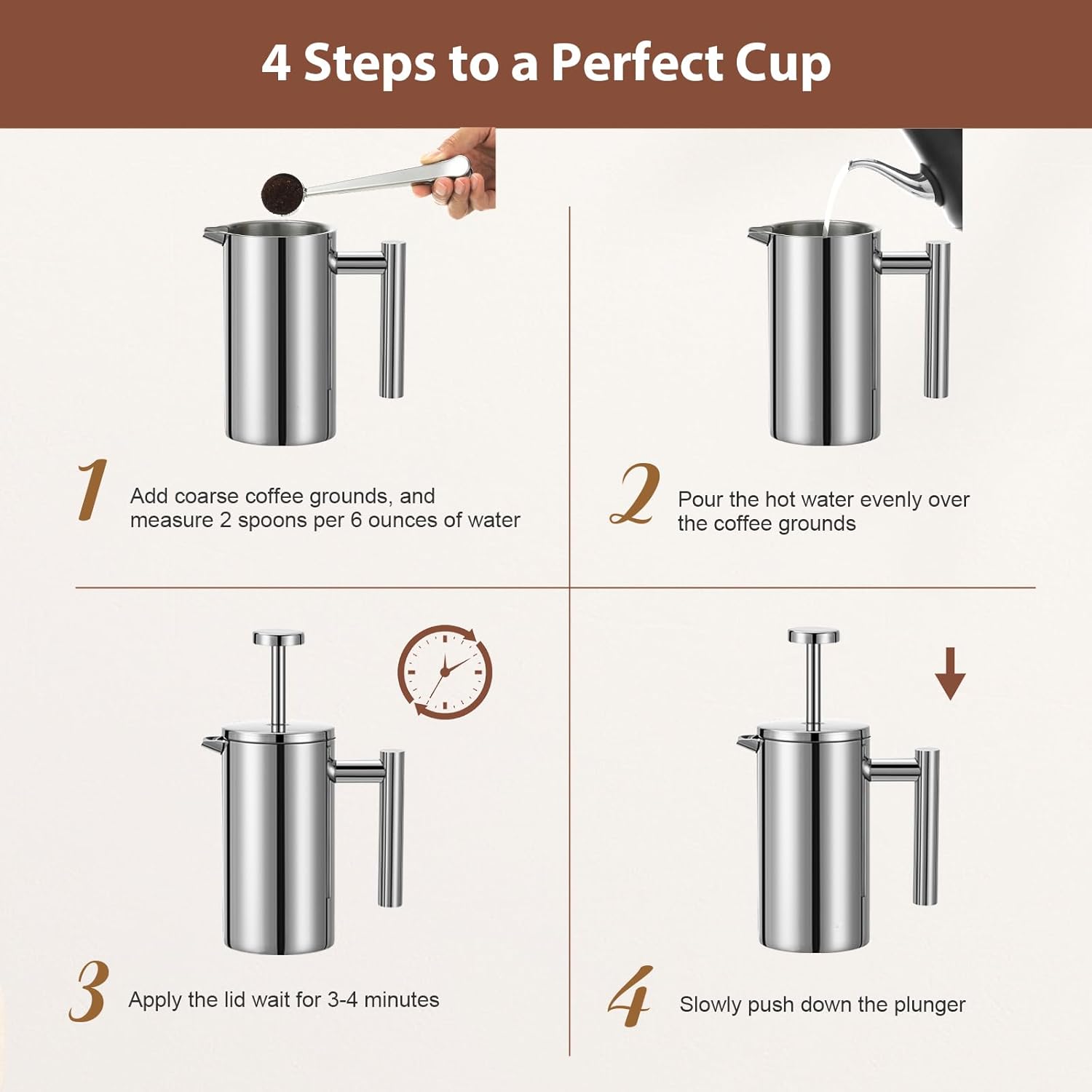 Heat Preservation – The cafetiere French Press made of 304 Double Wall stainless steel,can keep coffee or tea warm longer than thinner steel metal french press and glass models.