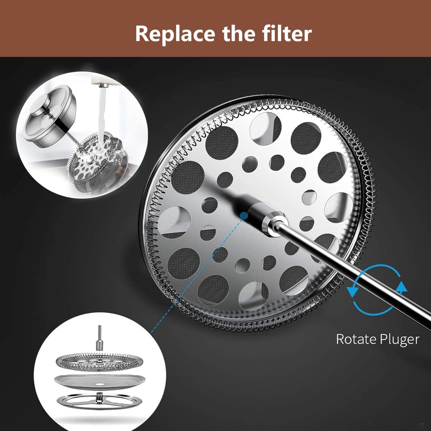 Easy to operate – The coffee press has a 3-layer filter system (which comes with three replacement filter) with a fine-woven filter and deep filtration to isolate the coffee grounds and retain the aroma and richness of the coffee, allowing coffee lovers to enjoy a pure and delicious taste.