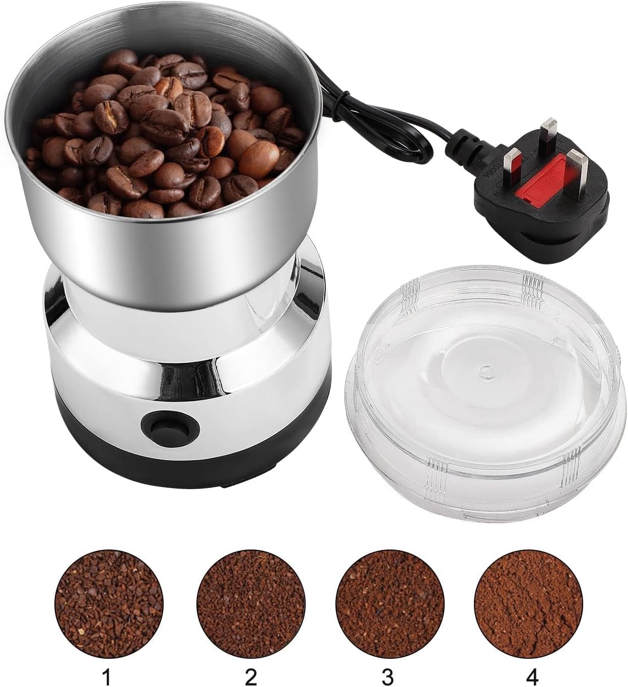 Featuring a transparent cover, this electric grinder allows visual monitoring of the grinding process, enabling adjustments for different coffee powder thicknesses according to personal preferences.