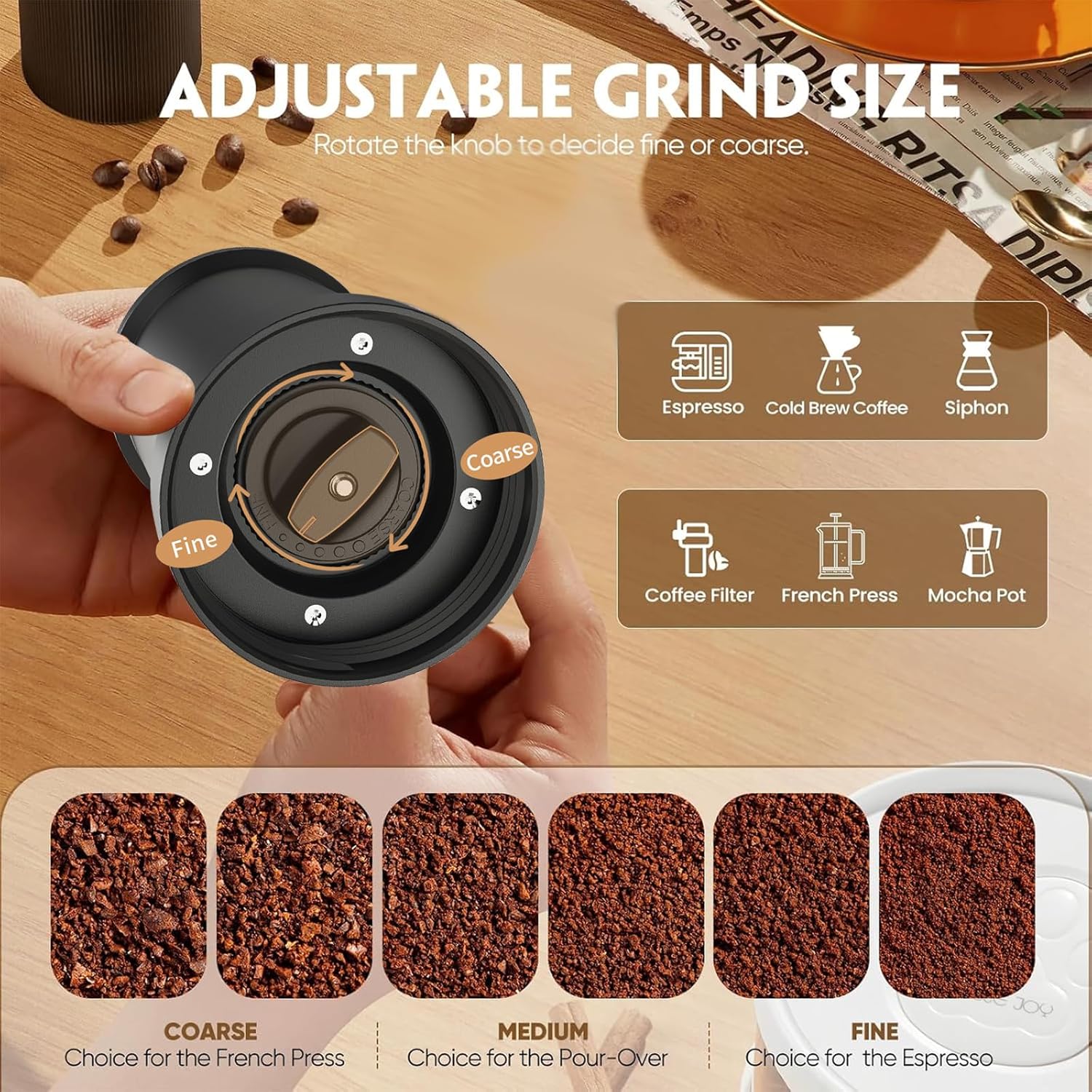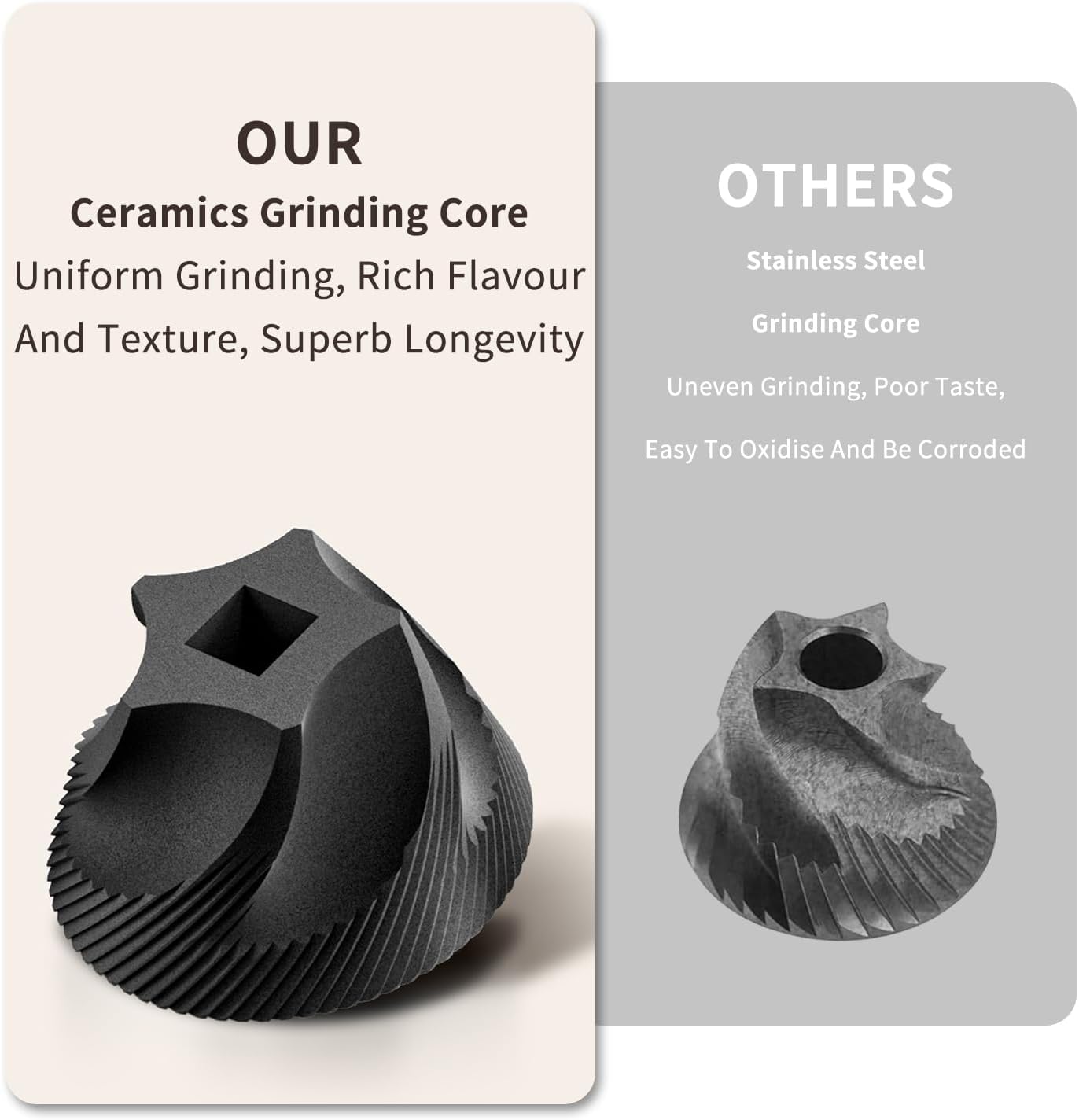 【HIGH PRECISION CERAMIC GRINDING CORE】- The coffee grinder is equipped with a high-precision ceramic grinding core, which provides a stable grinding effect, either coarse or fine grinding; the ceramic structure is rust-resistant, which ensures the purity and flavour of the coffee as well as safeguards the safety; in addition, it is easy to clean, which ensures the integrity of the coffee’s flavour and also enhances the brewing experience.