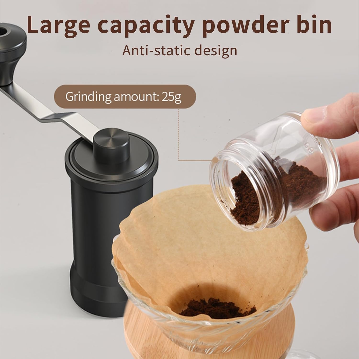 【LARGE CAPACITY POWDER COMPARTMENT DESIGN】- This coffee grinder manual has a large capacity coffee powder compartment, which can store up to 25 grams of powder for each grind to meet your brewing needs; the split compartment adopts an anti-static design to ensure a smooth discharge of the powder, and minimise the retention of powder in the wall, reducing grinding waste and improving efficiency, simplifying clean-up work.
