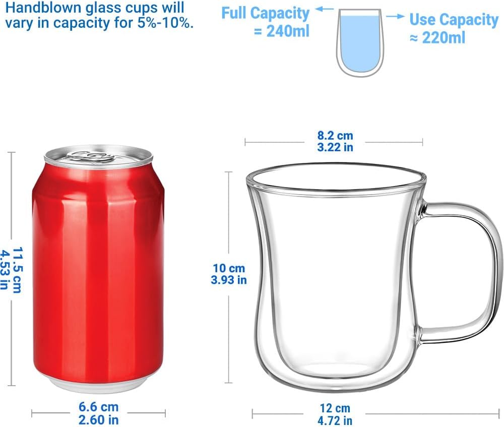 Double Wall: The double wall design keeps the cup safe to touch with hot drinks and free of condensation with cold ones. And also keeps your drinks hot or cold for longer than one layer glasses under the same conditions.