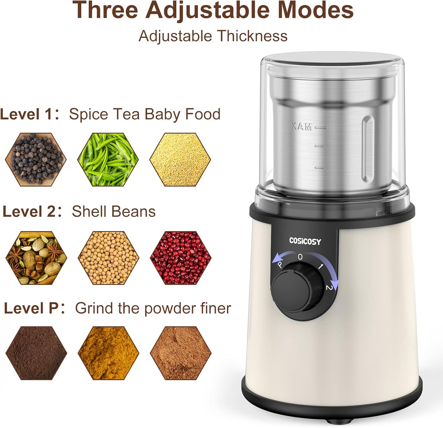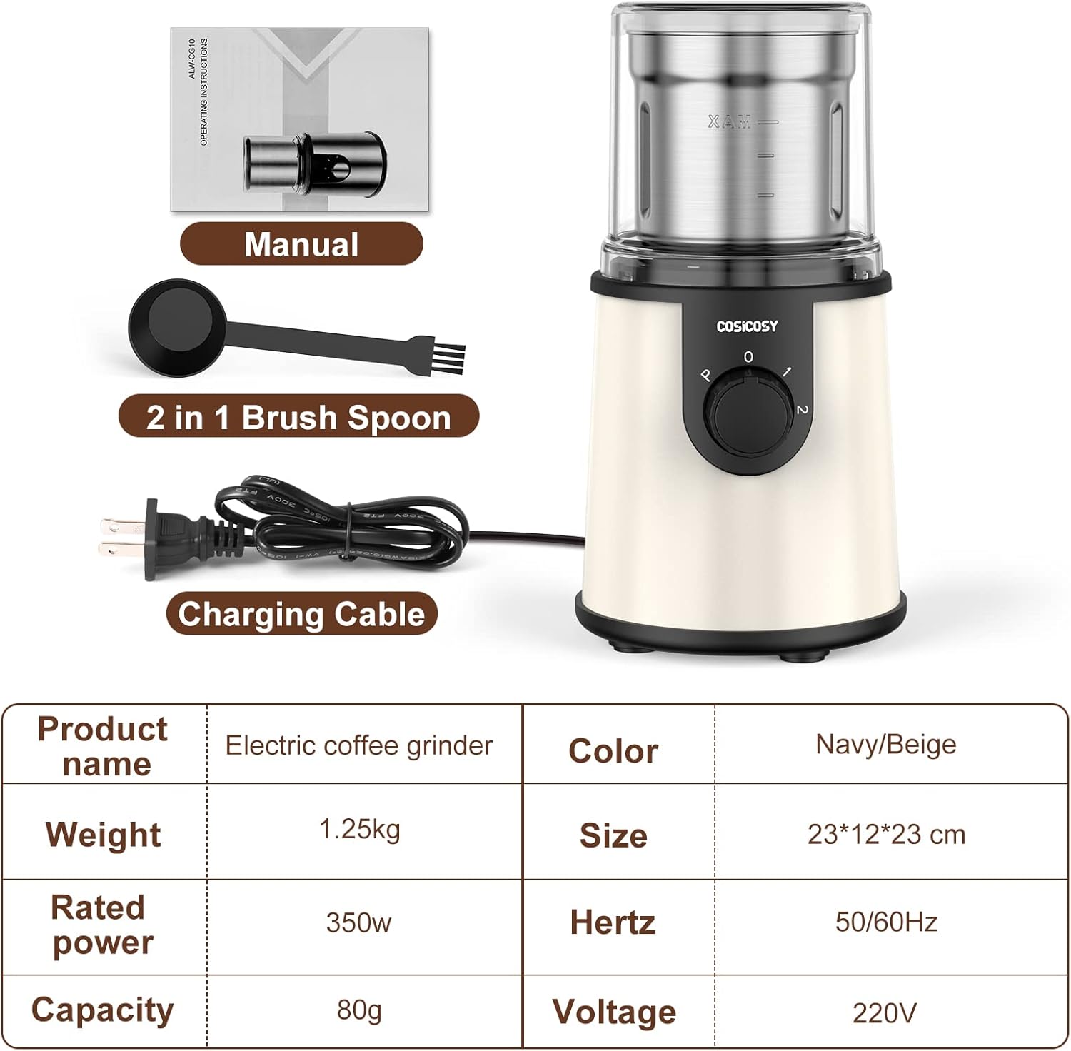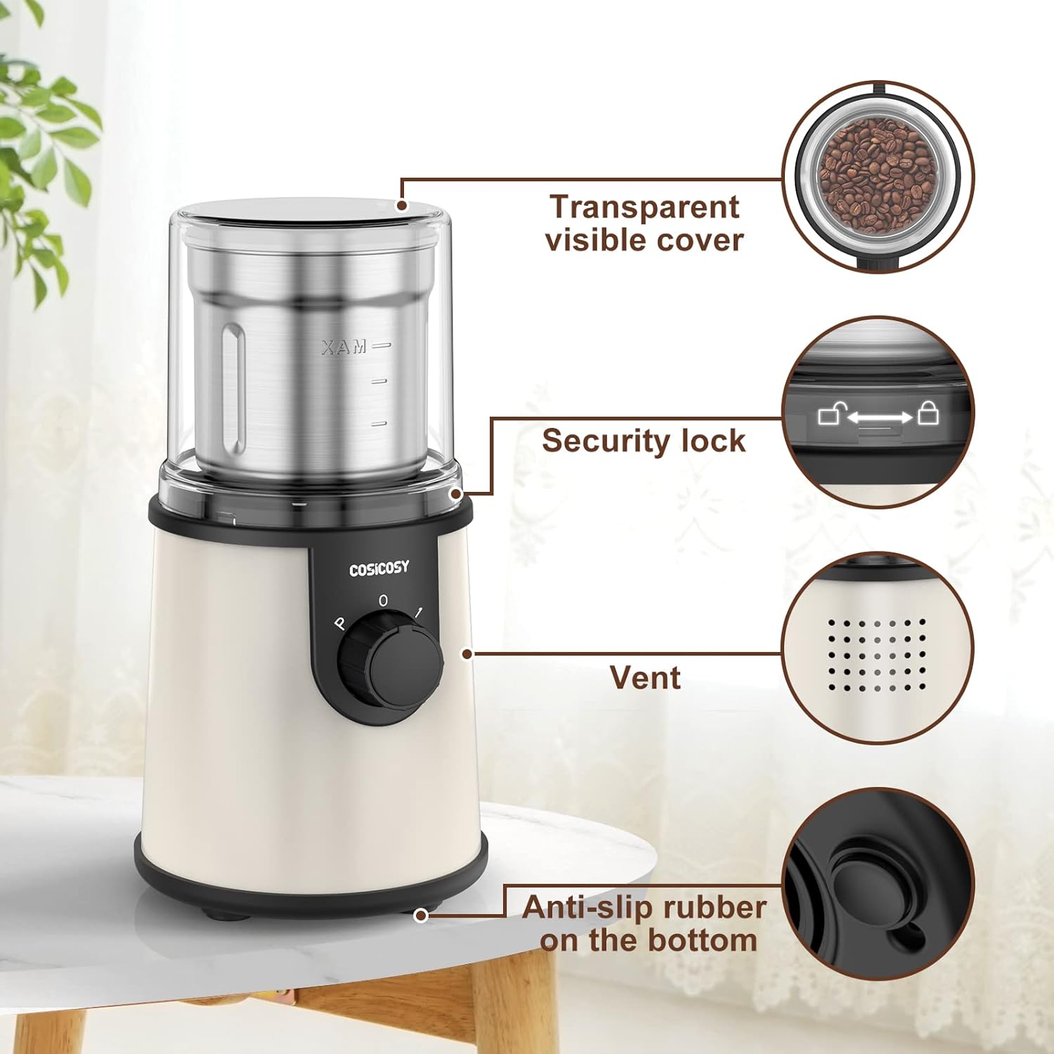 COSICOSY Electric Spice Grinder with 304 Stainless Steel Blades, Removable Bowls, 350W Motor Coffee Bean Machine with Spoon Brush for Beans, Nuts, Pepper, Beige