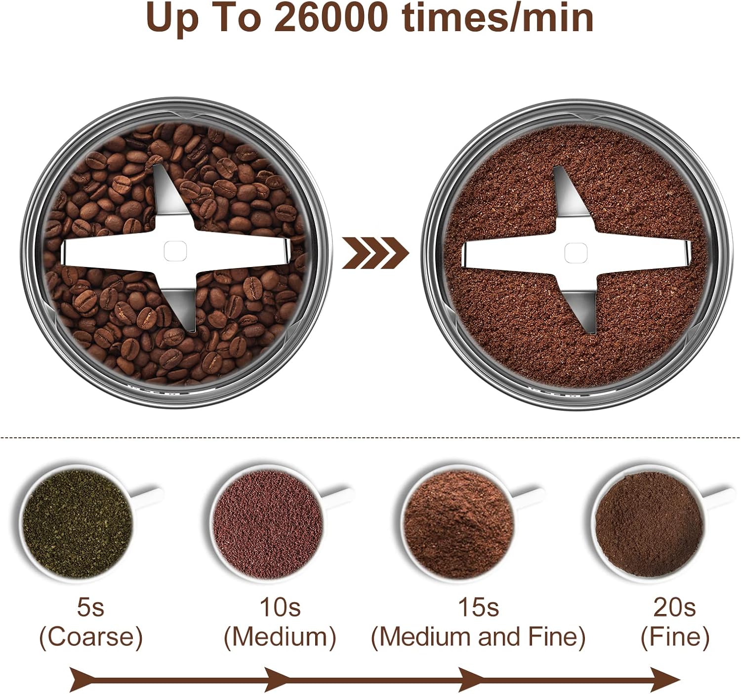 【Powerful 350W Motor】 The electric coffee grinder equipped with a 350W motor and SUS 304 stainless steel blades, 26000r/min grinding jobs in 5-20 seconds. The strong motor also makes it easy work of larger harder items, such as nuts, Chia seeds, and even nutmeg. Built-in overheat protection design extends its lifespan.